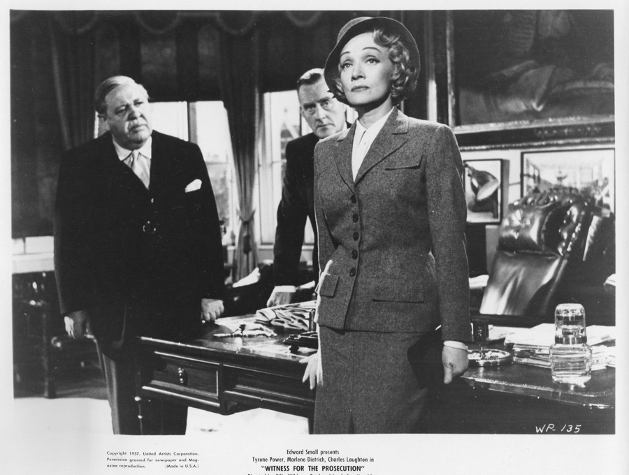 玛琳·黛德丽扮演了克里斯汀·海尔姆,这是为数不多有能力和查尔斯·劳顿同场时旗鼓相当的女演员,尽管她在《控方证人》里的戏份还不如护士小姐,只在开场时的律所和后来的庭审中短暂出场。克里斯汀出现在韦尔面前时,穿一身廉价的灰色套装,一头金发梳得一丝不苟,当丈夫面临谋杀指控,她作为妻子显得过于镇定,甚至在面对老谋深算的韦尔律师审视时,她利落地拉下百叶窗帘来掩饰自己。读过小说原作或看过不止一遍电影的观众当然知道,她闪烁其词描述出的丈夫是劣迹斑斑的狩猎者,这是悲哀的真相。