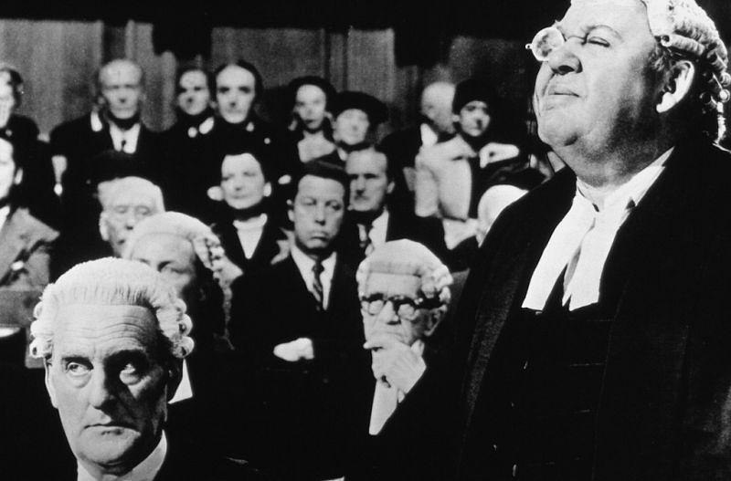 怀尔德导演经常强调,电影导演最忌讳炫耀他的剪辑技巧,那会让观众震惊于影像炫技而忽略“到底拍什么”。《控方证人》是一个会给大部分导演带来灭顶之灾的危险陷阱,它的全部情节集中发生在律所和庭审两个局限的室内空间,原作小说是以幽默语言驱动的“客厅戏”,这类题材被改编成电影,很可能就是让戏剧工作者群嘲的“银幕罐头戏剧”。平庸的电影导演为了证明“电影的能力”,会在单一空间的戏剧场景里拍出八百种花样,而杰出的导演怀尔德反其道行之,把影像的空间让渡给表演。他欣赏查尔斯·劳顿由来已久,尽管他们的这次合作据说在片场口角不断,但导演仍然用低微的电影姿态去呵护成全了他所钦慕的表演。