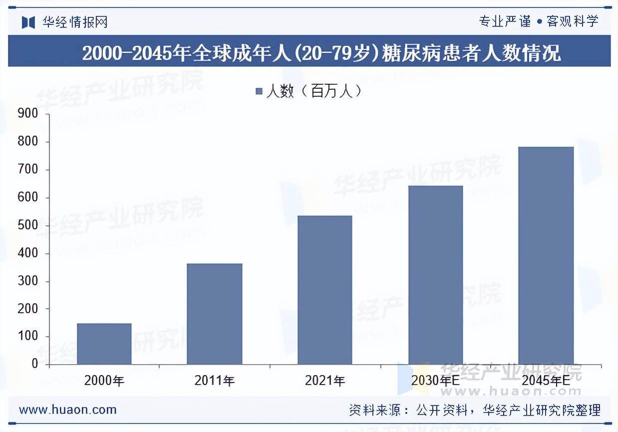 据IDF估计,2021年全世界有5.37亿20-79岁的成年人(占该年龄组所有成年人的10.5%)患有糖尿病;其中高收入国家患病人数为1.04亿人,中等收入国家患病人数为4.14亿人,低收入国家患病人数为0.19亿人。到2030年,预计将有6.43亿人患有糖尿病,到2045年,预计将有7.83亿20-79岁的成年人患有糖尿病。在此期间,虽然世界人口估计将增长20%,但糖尿病患者人数估计将增加46%。
